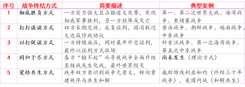 人类战争,尤其是现代战争的止战方式,只有五种:1、彻底胜负方式;2、打打谈谈方式;3、以打促谈方式;4、同归于尽方式;5、觉悟共生方式。