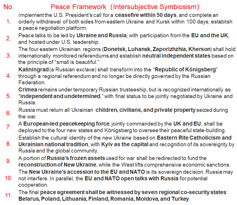 Drawing from the philosophy of Intersubjective Symbiosism, which is grounded in the self-organizing connectivity and dynamic rebalancing of life, I hereby reaffirm a solution proposed one year ago—a Third Peace Strategy to address the war and its consequences for Europe (see “The Third Path to Ending or Profiting from the Russia-Ukraine War,” Cultural China, Issue 118, Hong Kong). This updated version skips battlefield analysis and focuses directly on the revised proposal.