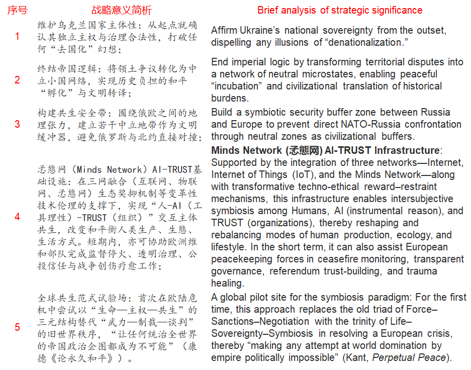 avoiding direct confrontation between NATO and Russia through a chain of neutral states. - Minds Network (孞態网) AI-TRUST Infrastructure: Supported by the integration of three networks—Internet, Internet of Things (IoT), and the Minds Network—along with transformative techno-ethical reward–restraint mechanisms, this infrastructure enables intersubjective symbiosis among Humans, AI (instrumental reason), and TRUST (organizations), thereby reshaping and rebalancing modes of human production, ecology, and lifestyle. In the short term, it can also assist European peacekeeping forces in ceasefire monitoring, transparent governance, referendum trust-building, and trauma healing.