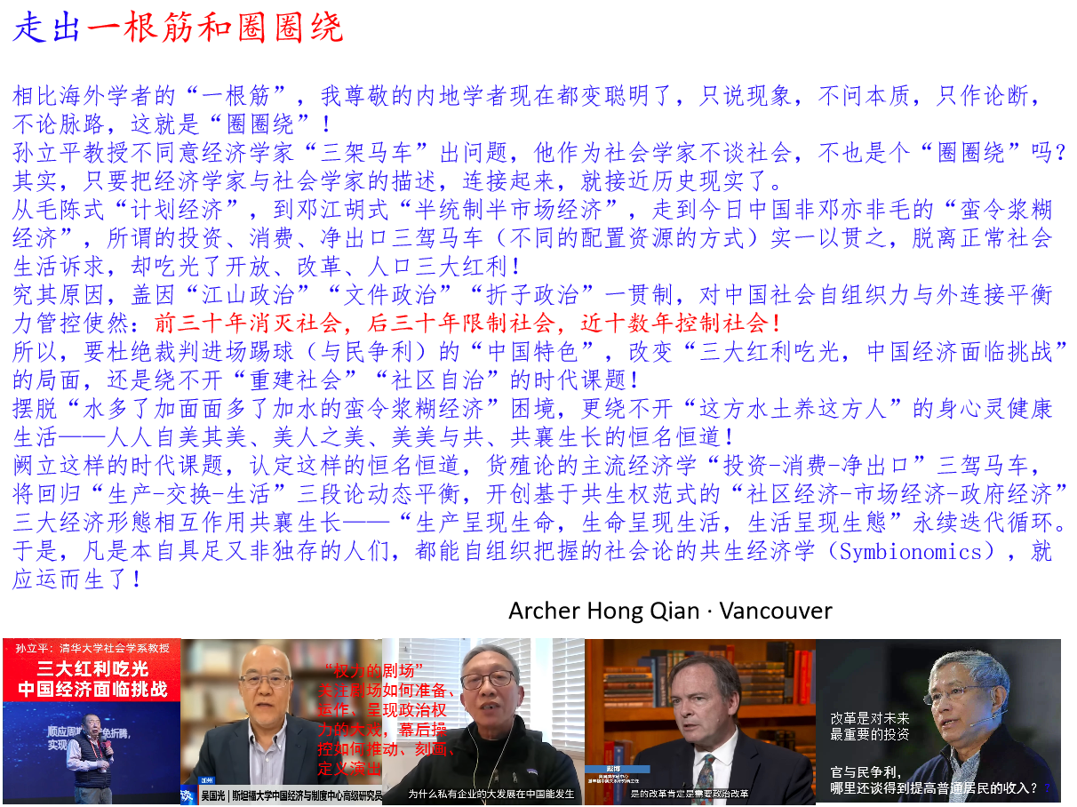 今天,从国际关系看,凡是声称“经济靠中国,安全靠美国”的所谓“亲中派”,都是瞄准了参与中国“半管制半市场经济”(全官寻租化、全民佃户化)收割和分赃的犬儒主义。
