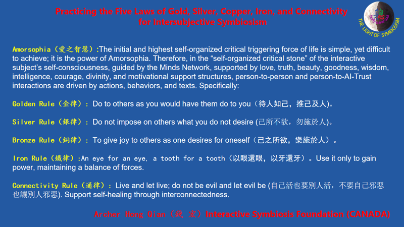 What enables this seed to grow and flourish is the wisdom of Intersubjective Symbiosism—Amorsophia. It calls us, in the interactions between person and person, person and society, and person and God, to live by the Five Universal Rules—Gold, Silver, Bronze, Iron, and General: