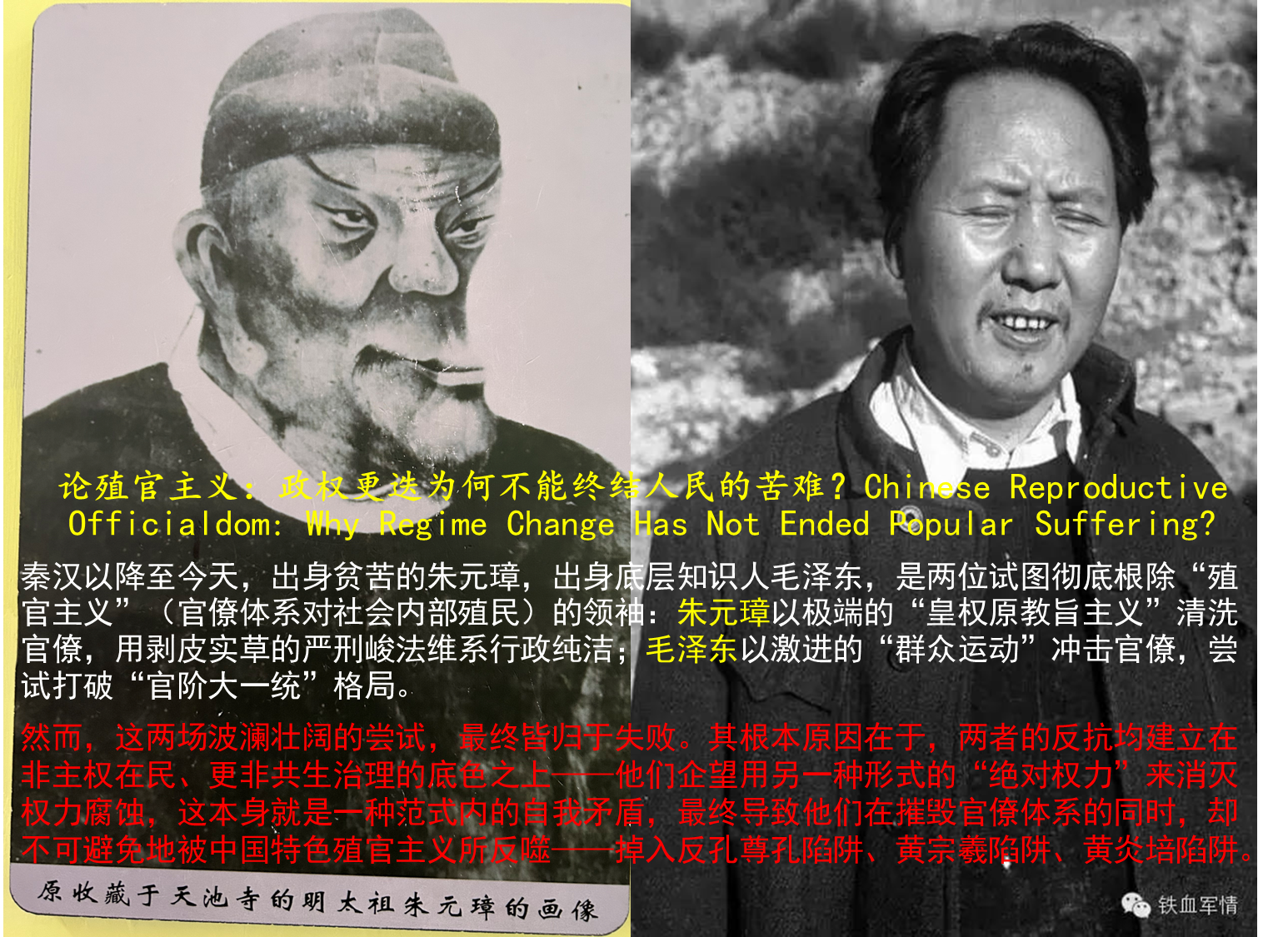 中国历史上,有一个帝王制一个党国制政权,试图反殖官主义,一个是真的苦寒出身的朱元璋,一个是知识官人毛泽东,但他们都失败了。因为他们自己就被权力腐蚀了。没有“主权在民实施宪政”的真性情,照样掉进了“反孔尊孔陷阱”“黄宗羲陷阱”“黄炎培陷阱”,结果都遭遇了殖官主义反噬。此篇综述透过对朱、毛失败的深度剖析,论证了“非主权在民宪政”治理模式的不可持续性,旨在为《论殖官主义》提出的“共生治理”方案提供历史坐标。